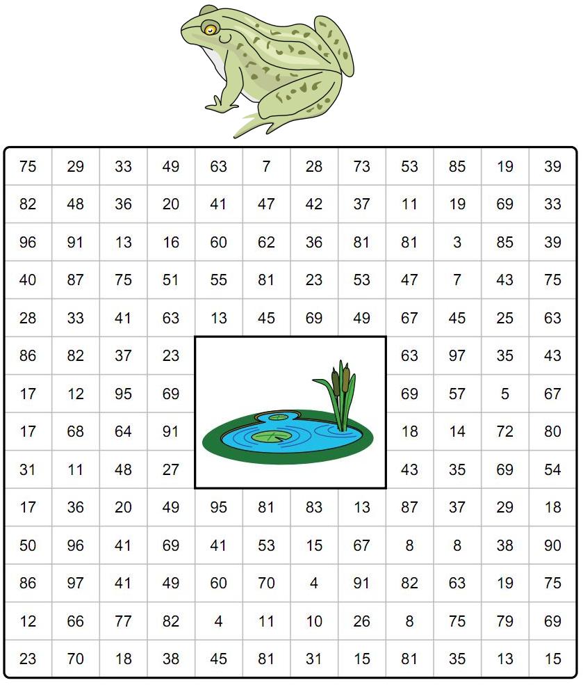 Kurbağaya göle ulaşmasına yardımcı olur musunuz? Çift sayılardan bir yol çizerek göle ulaşmasını sağlayın. Sadece birbirine bitişik kutucuklardan geçebilir. (üst satırdan başlayınız)