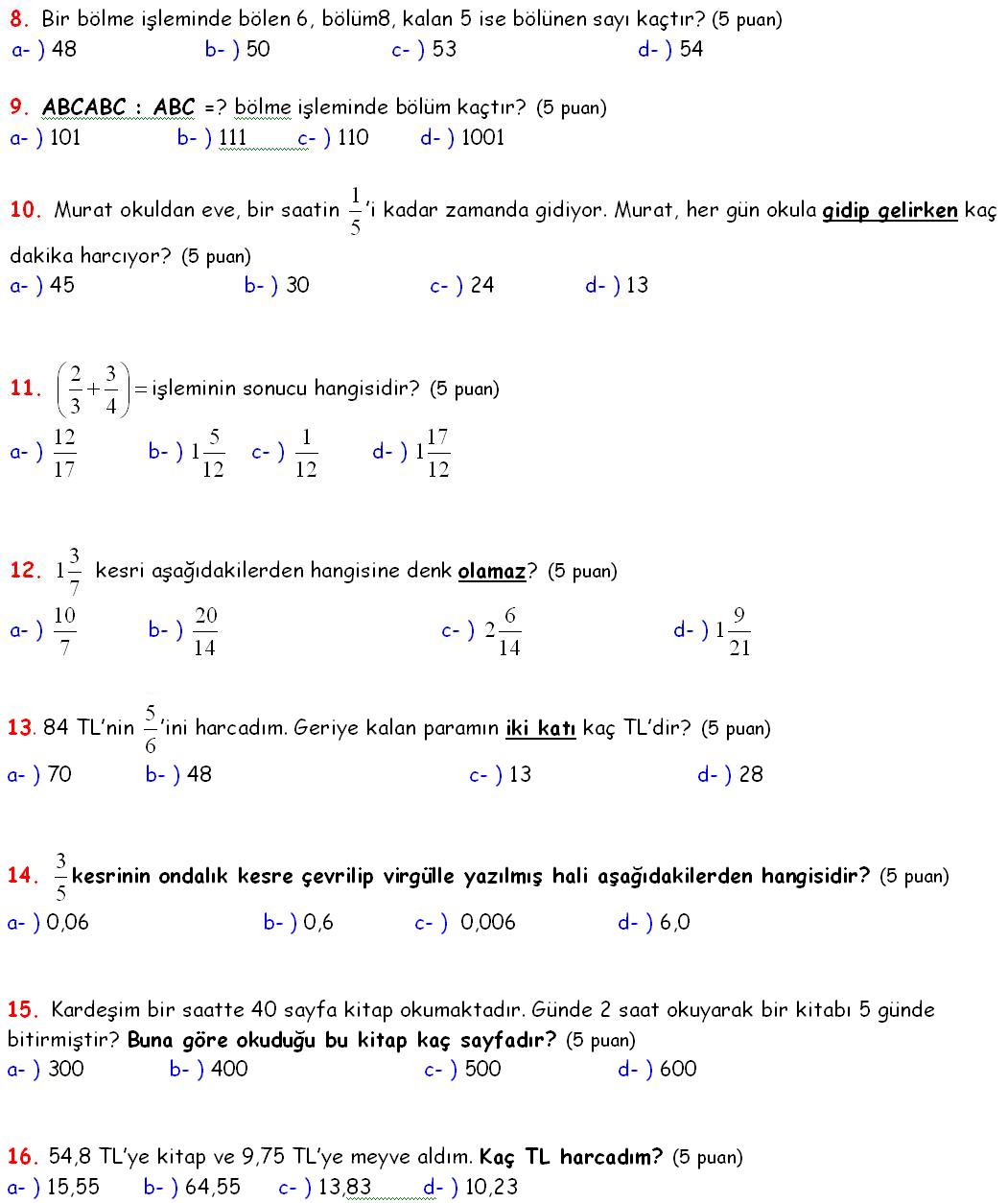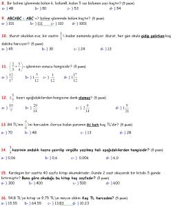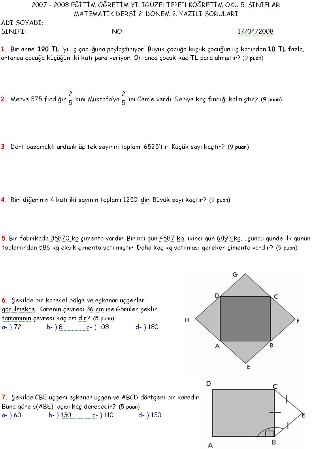 5. Sınıf Matematik Dersi 2. Dönem 2. Yazılı, Matematik 5. Sınıf 2. Dönem 2. Yazılı