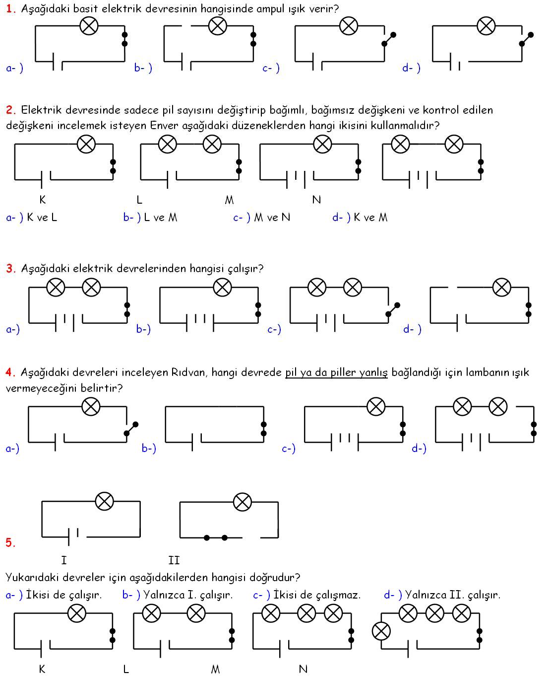 5. Sınıf Fen ve Teknoloji Dersi Yaşamımızdaki Elektrik Ünitesi Basit Elektrik Devresi Soruları