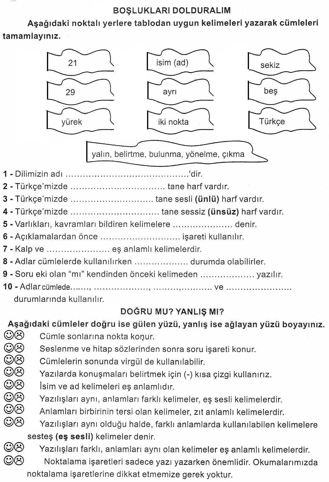 4 Sınıf Türkçe Dersi Boşluk Doldurma Doğru Yanlış Etkinliği