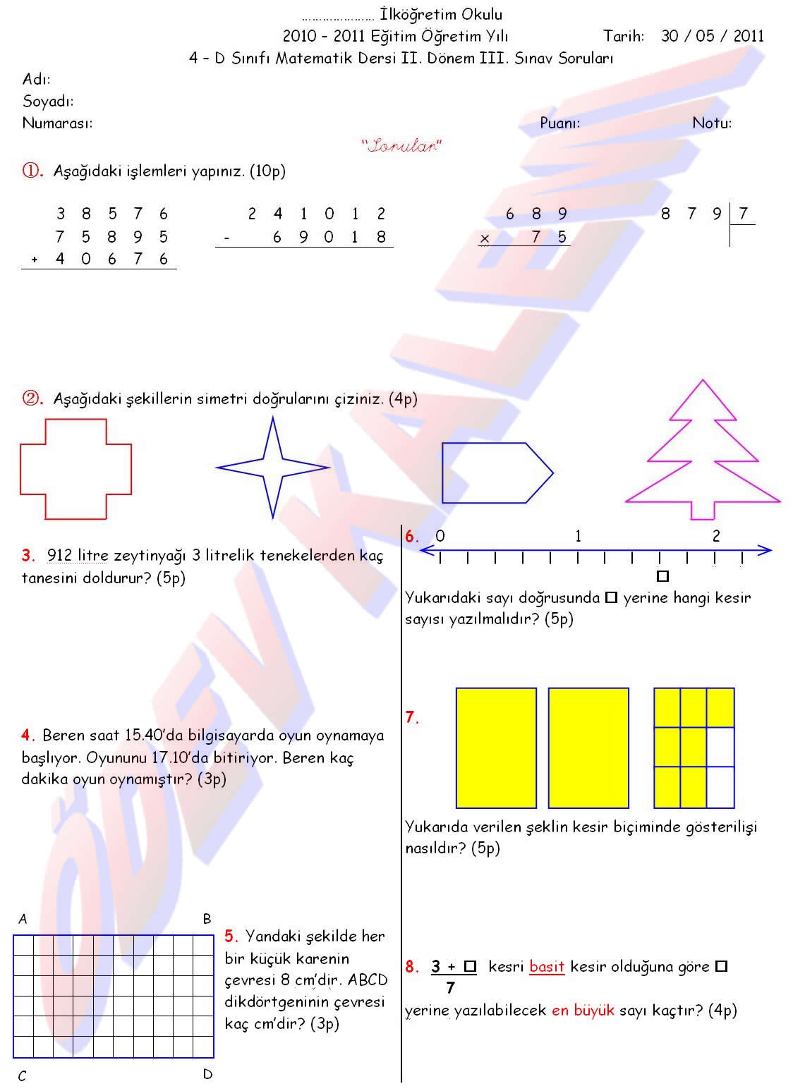4. Sınıf Matematik Dersi 2. Dönem 3. Yazılı Soruları Sınav Etkinliği Çalışma sayfası kağıdı yaprağı öğrenci çalışma fotokopisi değerlendirme indir bul ara çöz ders konu tekrarı kesirler geometri simetri konuları