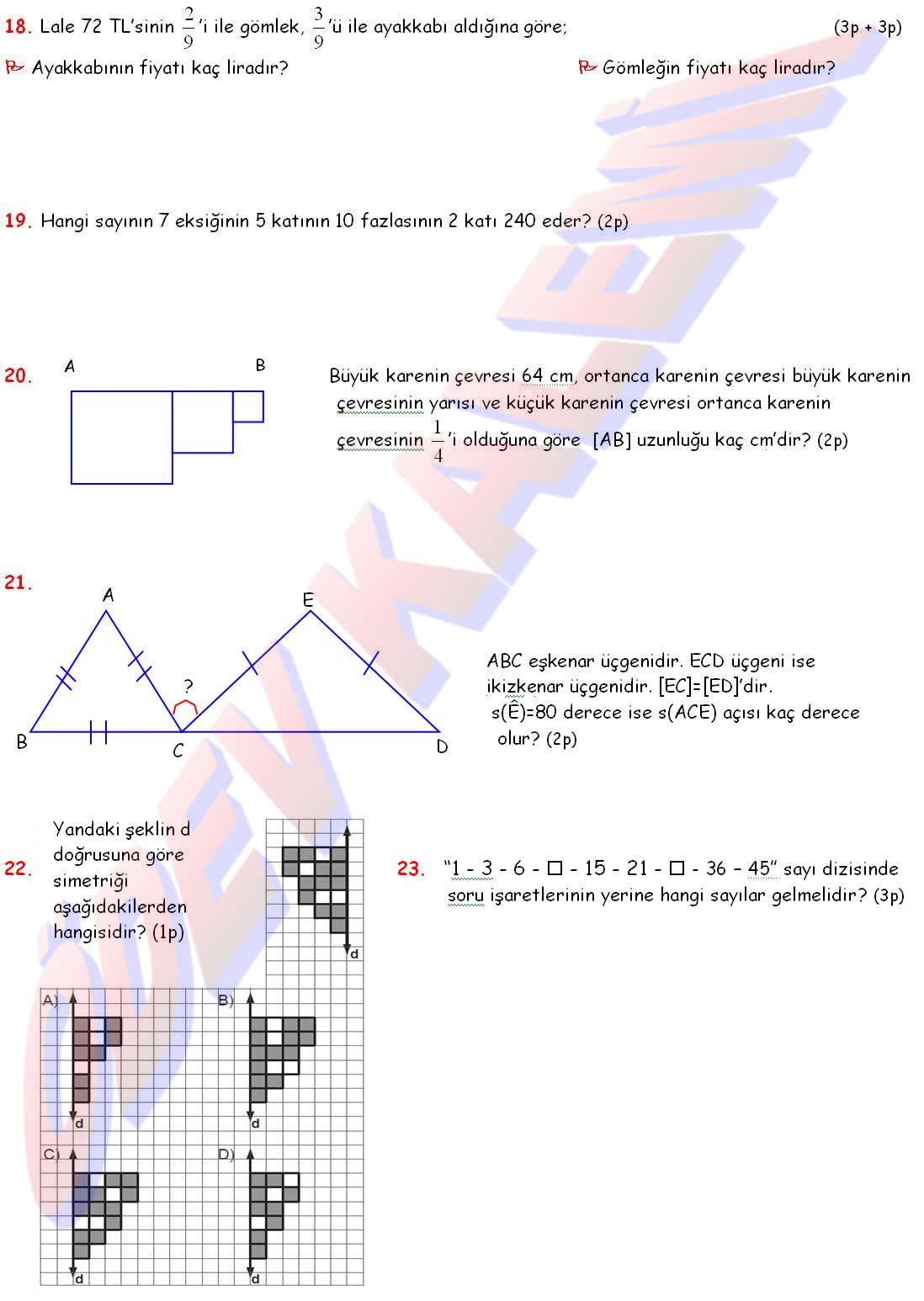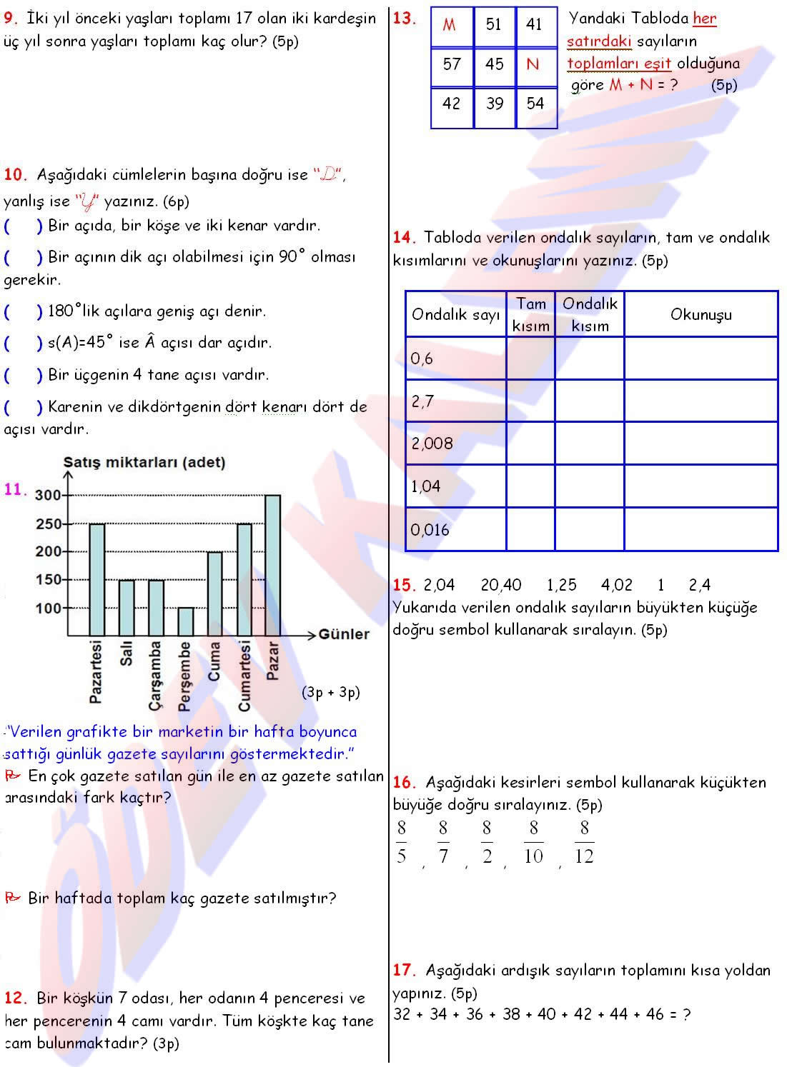 4. Sinif Matematik Dersi 2. Dönem 3. Yazili Sorulari