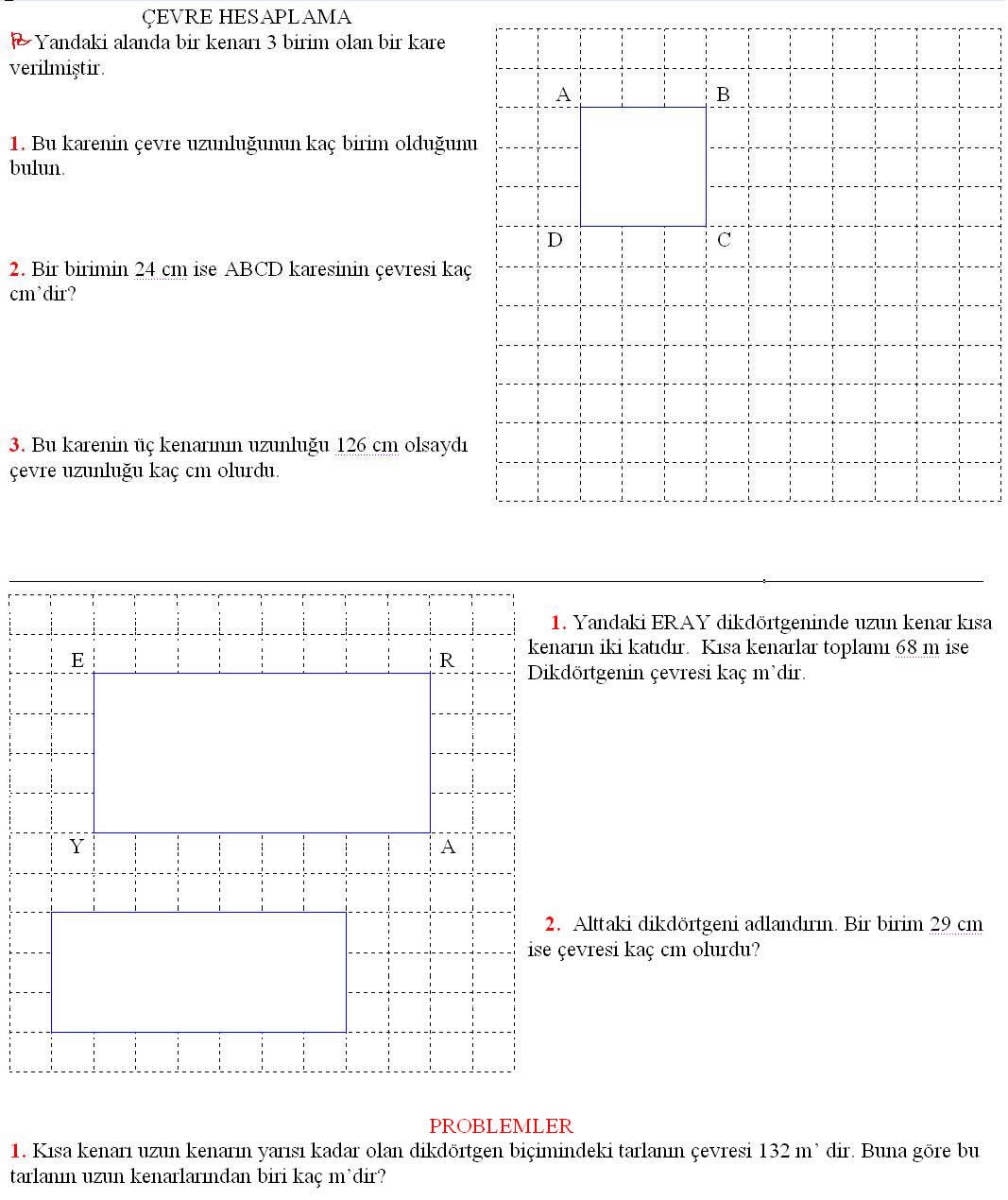 4. Sınıf Matematik Dersi Çevre Hesaplamaları Problemleri Etkinliği Çalışma sayfası kağıdı yaprağı öğrenci çalışma fotokopisi değerlendirme indir bul ara çöz ders konu tekrarı