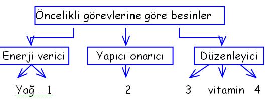 Besin çeşitlerinin öncelikli görevlerine göre gruplandırıldığı aşağıdaki şemada bazı kısımlar numaralar ile gösterilmiştir.