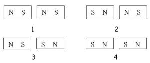 4. Mıknatıslar yukarıdaki şekillerdeki gibi birbirine yaklaştırılıyor. Mıknatısların birbirini etkileme şekli hangi seçenekte doğru verilmiştir?