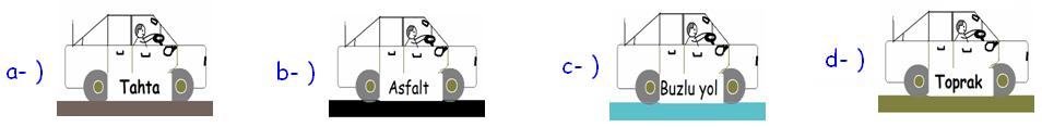 8. Bir oyuncak arabaya eşit kuvvet uygulanarak arkasından itilip, bırakılıyor. Bu araba en çok hangi zeminde yol alır?