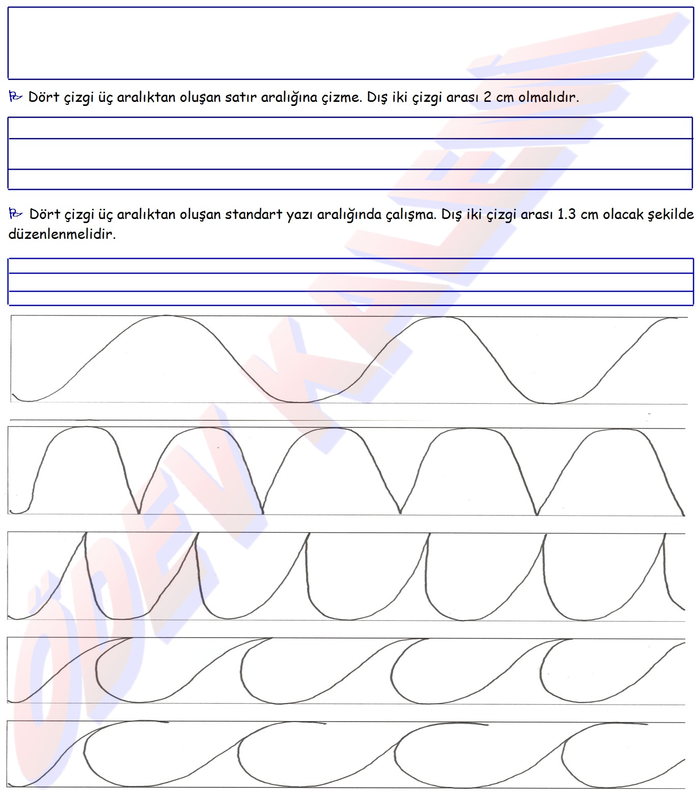 2. Düzenli çizgi çalışmaları: Bu aşamada yapılacak çizgi çalışmaları harfleri yazmaya hazırlık niteliğindedir. Bu amaçla şu çalışmalar yapılabilir.