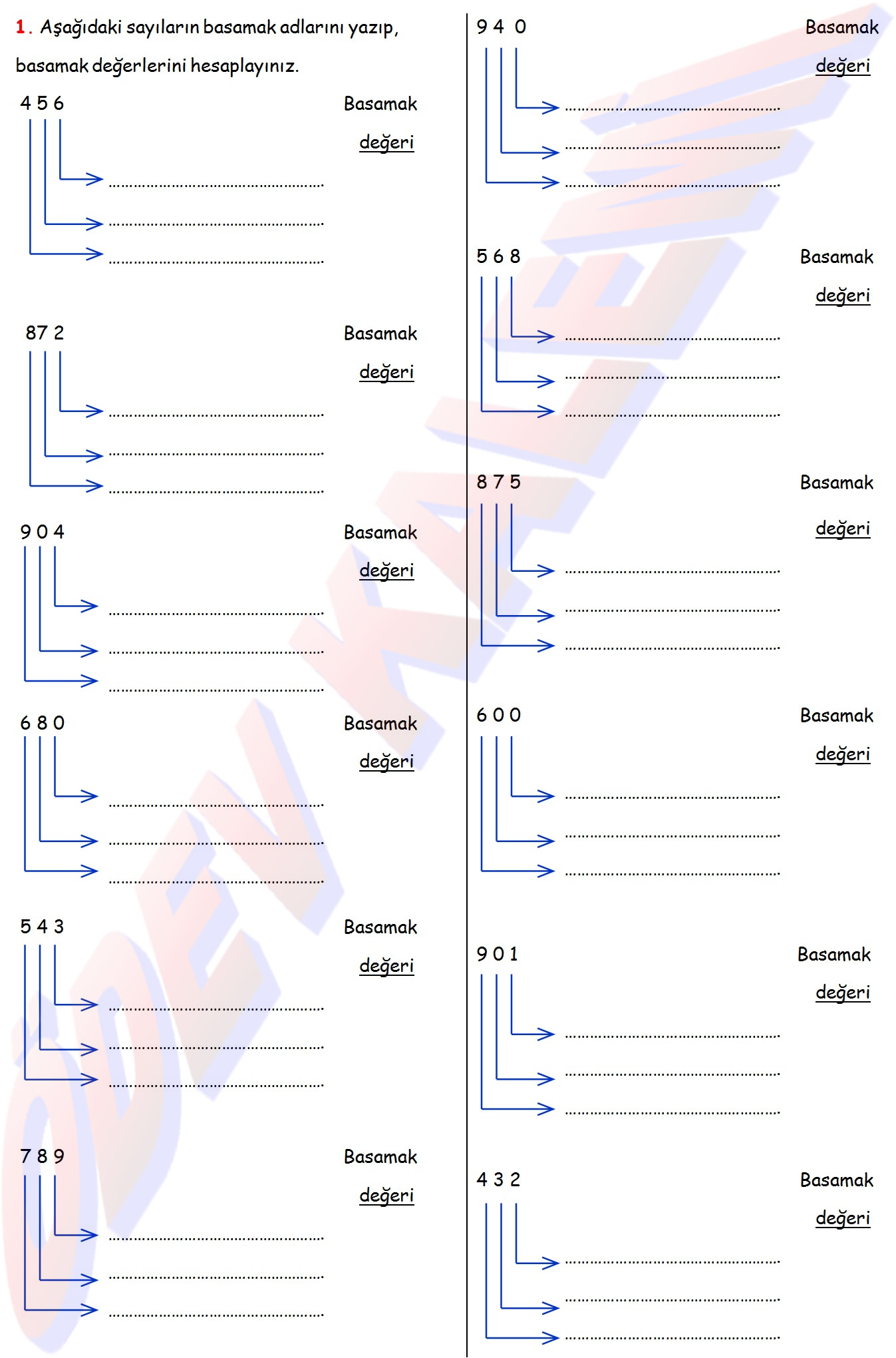3. Sınıf Matematik Dersi Doğal Sayıların Basamak Değerini Yazma etkinlikleri sayfası kağıdı yaprağı fotokopi ders ödev öğrenci ev çalışması