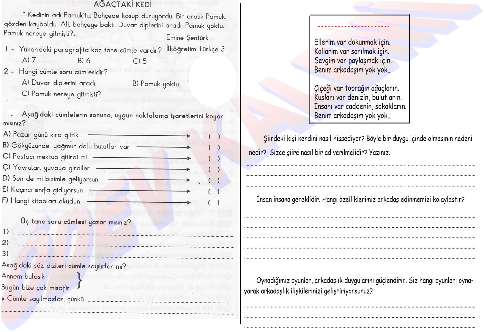 3. sınıf Türkçe Dersi cümle bilgisi etkinliği ödevi kağıdı sayfası yaprağı indir ders ara bul Türkçe Dersi