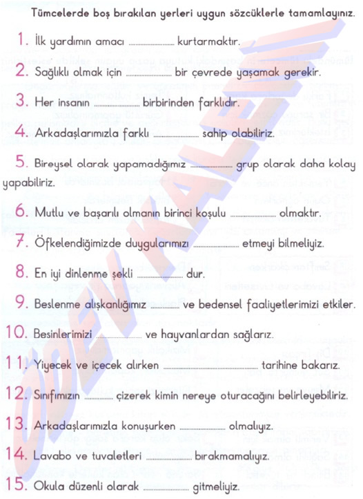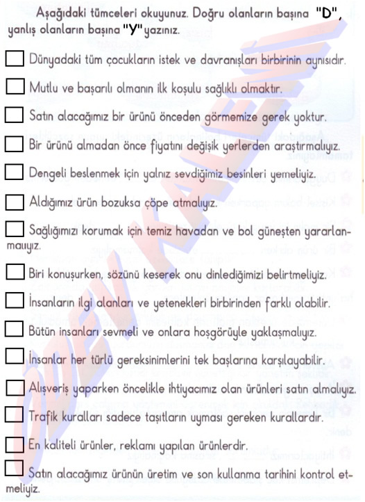 3. sınıf Hayat Bilgisi Dersi boşluk doldurma doğru yanlış etkinliği sayfası kağıdı yaprağı çöz yaz çiz fotokopi
