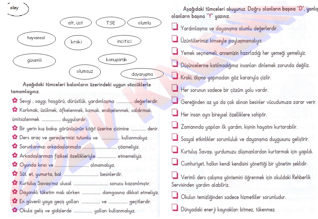3. sınıf Hayat Bilgisi Dersi Okul Heyecanım boşluk doldurma doğru yanlışp etkinliği sayfası kağıdı yaprağı ders ödev fotokopi