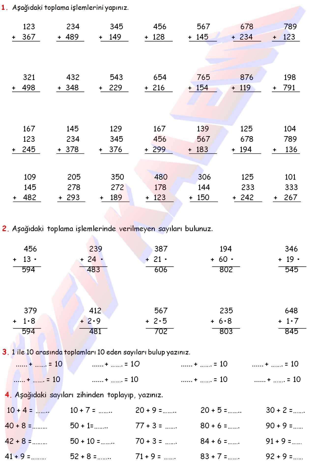 3. Sınıf Matematik Dersi Doğal Sayılarla Toplama işlemleri sayfası kağıdı yaprağı fotokopi ders ödev hesapla verilmeyen toplananı bulma üç basamalı doğla sayılarla üç basamaklı doğal sayıları eldeli toplama