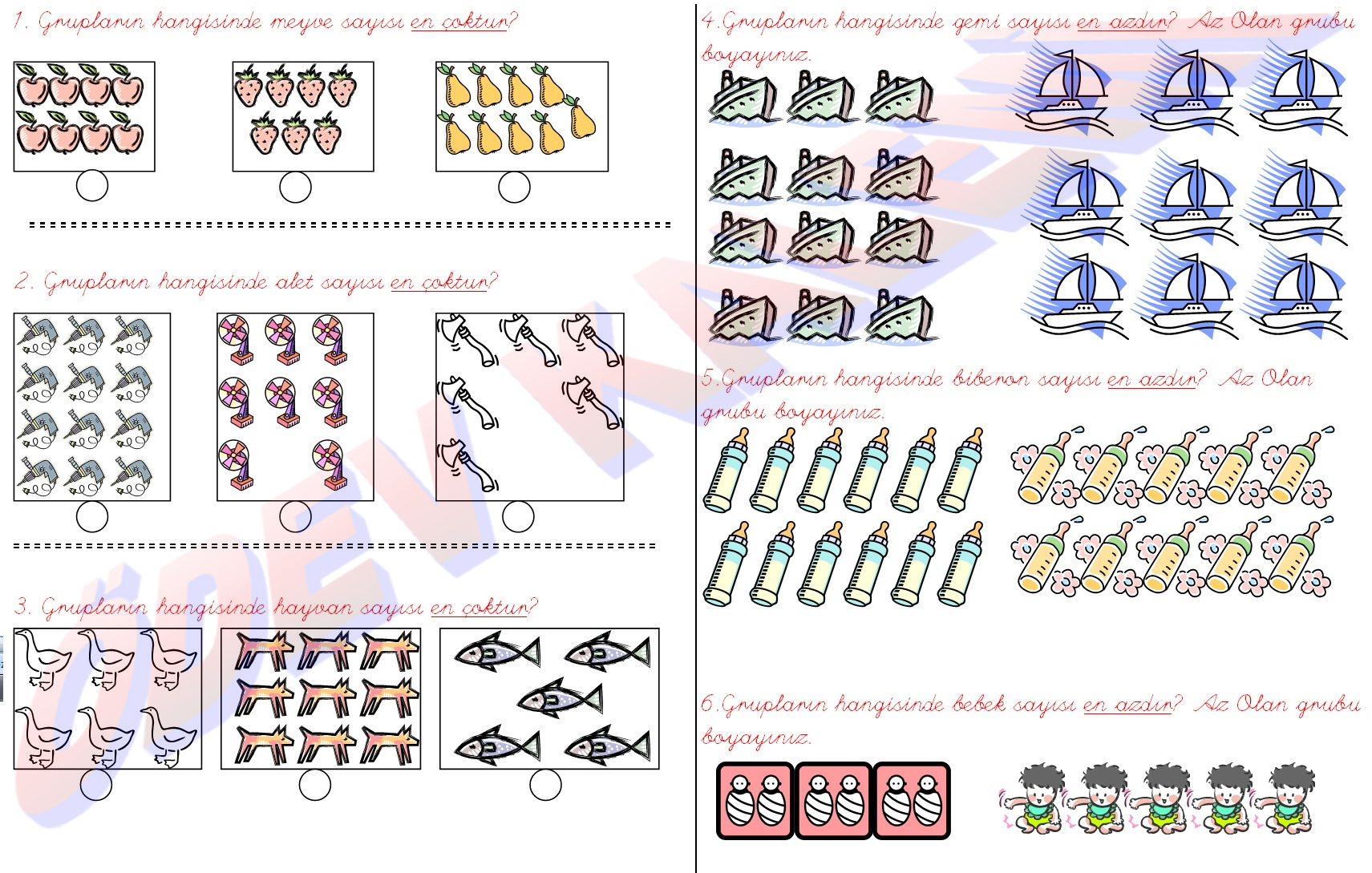 1. sınıf Matematik Dersi Azlık Çokluk etkinliği sayfası kağıdı yaprağı fotokopi ders
