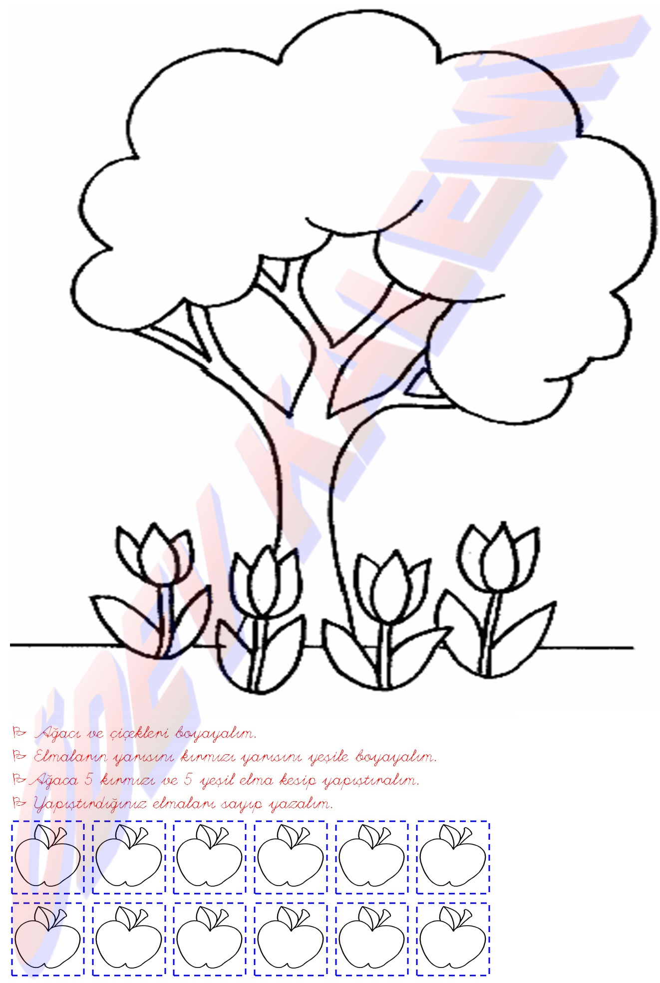 1. sınıf matematik dersi rakamları kavrama belirtilen sayıdaki elmayı ağaca yapıştırma etkinliği sayfası kesme yaprağı fotokopi ders ödev boyama