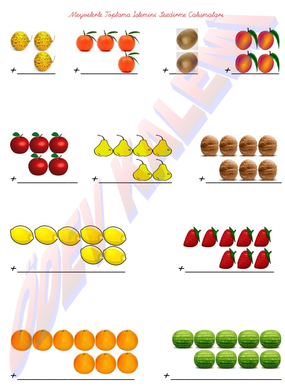 1. Sınıf Matematik Dersi Meyvelerle Toplama işlemini Sezdirme Çalışmaları etkinliği sayfası kağıdı yaprağı fotokopi ders ödev indir
