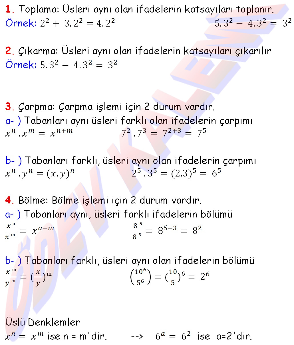Üslü Sayılarda ifadelerde dört 4 işlem, üslü sayılarla işlemler, üslü sayıların özellikleri, 8. Sınıf Matematik Dersi konu anlatımı örnekli problem çözümü, toplama çıkarma çarpma bölme çöz bul bak