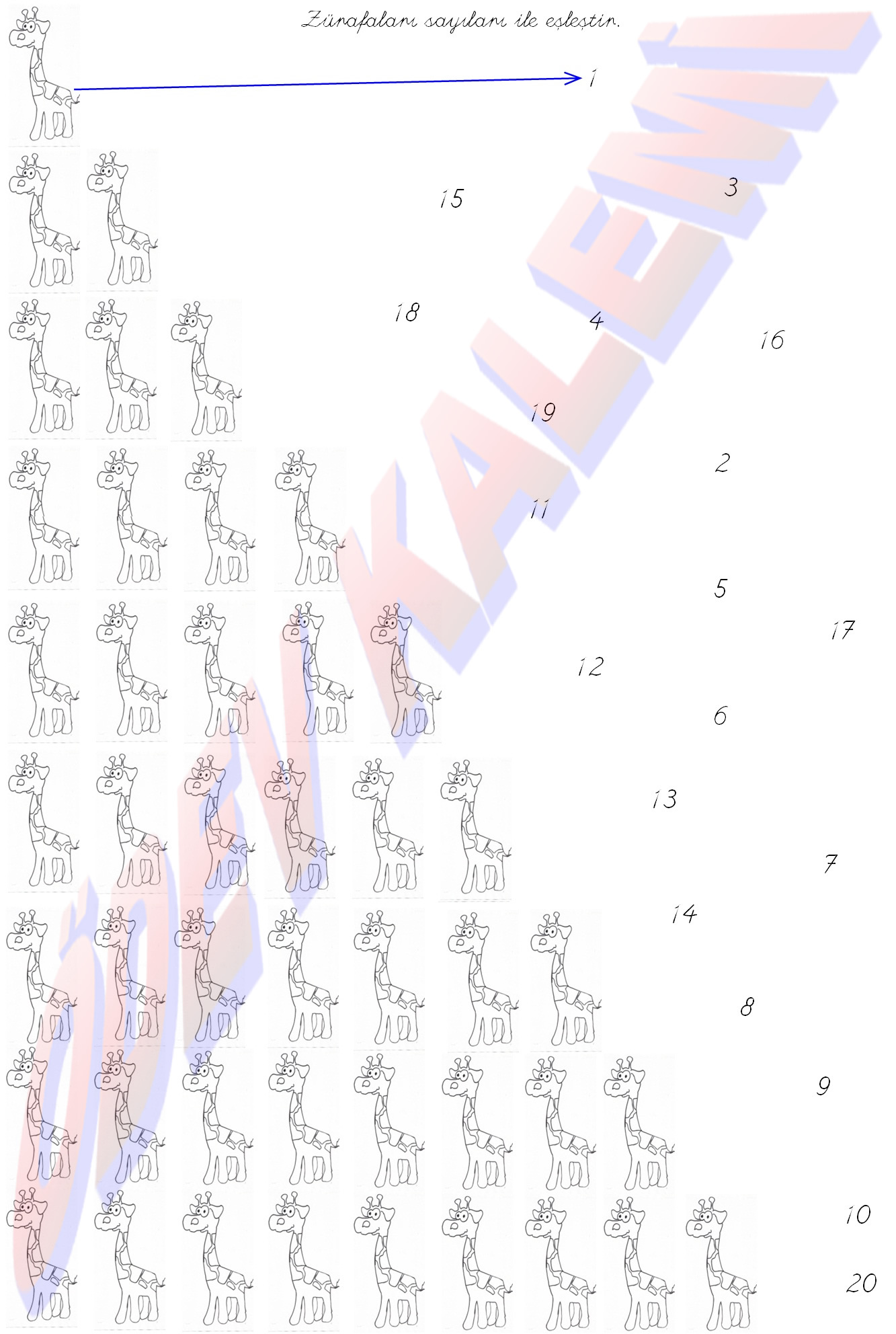 Eşleştirme Rakamları Zürafa Sayılarıyla Eşleştirme 1. sınıf matematik dersi etkinliği sayfası kağıdı yaprağı ders ödev fotokopi indi çöz