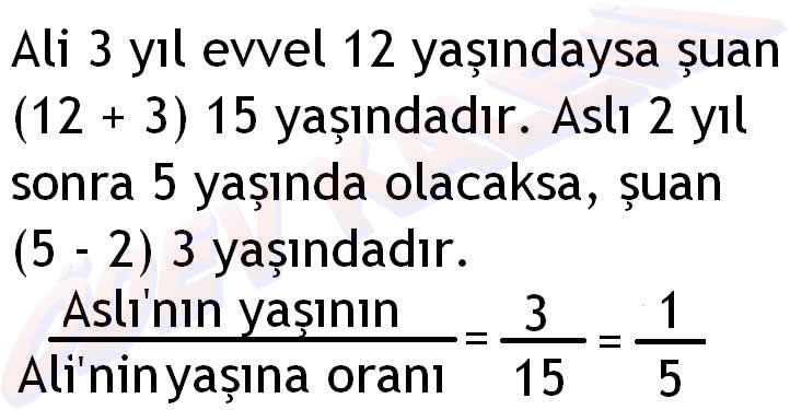 9.  Ali 3 yıl evvel 12 yaşındaydı, Aslı ise 2 yıl sonra 5 yaşında olacaktır. Aslı’nın bugünkü yaşının, Ali’nin bugünkü yaşına oranı kaçtır?