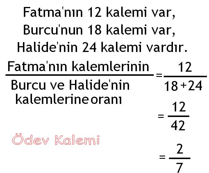 10.  Fatma’nın 12, Burcu’nun 18 ve Halide’nin 24 kalemi varmış. Fatma’nın kalemlerinin Burcu ve Halide’nin kalemlerine oranı kaçtır?