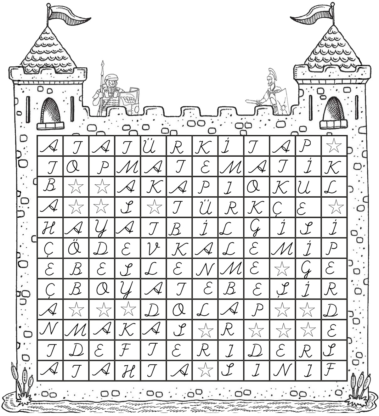 P Okulda ve sınıfta kullandığımız kelimeler şatonun duvarına gizlenmiştir. Gizli olan kelimeleri bulup boyayınız. Boyanmadan kalan kelimeler şifreyi oluşturmaktadır.