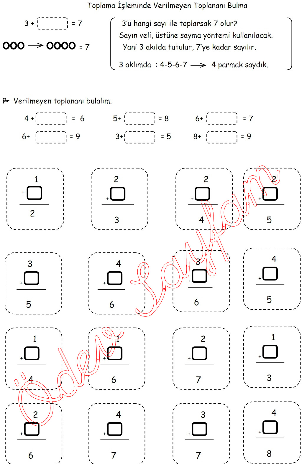 verilmeyen toplananı bulma 1. sınıf matematik dersi, anlatım, şekilli açıklama
