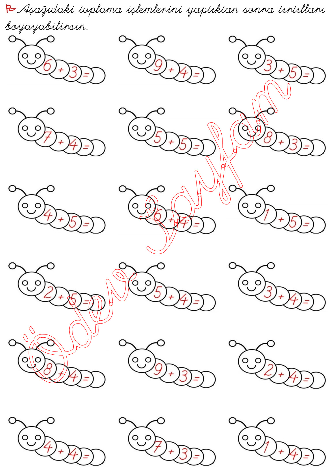 resimli (topla ve boya) Bir Basamaklı Doğal Sayılarla Bir Basamaklı Doğal Sayıları Toplama işlemleri 1. Sınıf Matematik Dersi