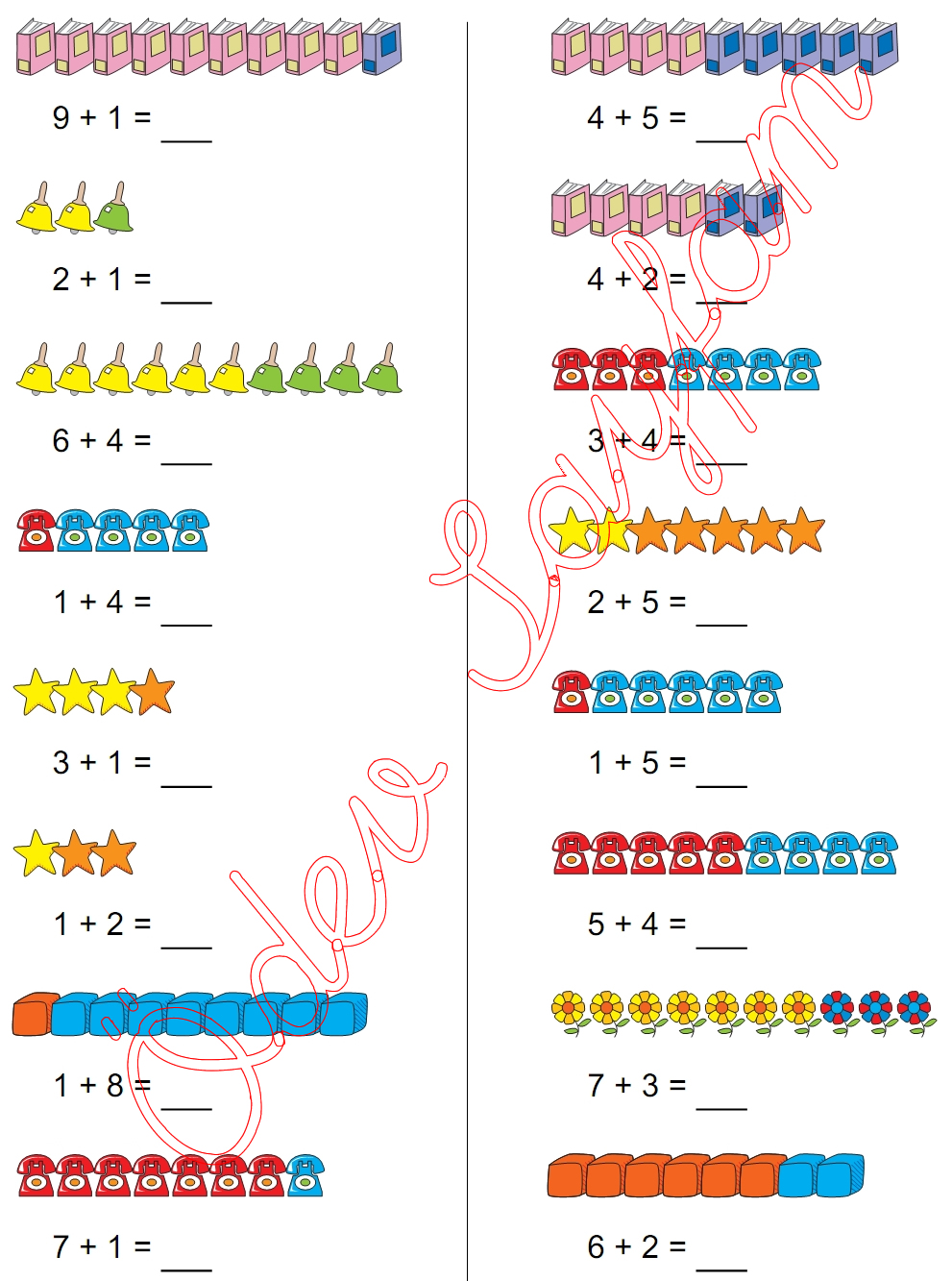 İlköğretim 1. Sınıf Matematik Dersi toplama işlemi yapmayı öğreniyorum toplamları 10’u (onu) geçmeyen bir basamaklı doğal sayılarla bir basamaklı doğal sayıların yan yana toplam alıştırmaları. Etkinlik resimli – şekilli ve renkli olarak hazırlamış olup öğrencilerin dünyasına hitap eden onların ilgisini çekebilecek niteliktedir.