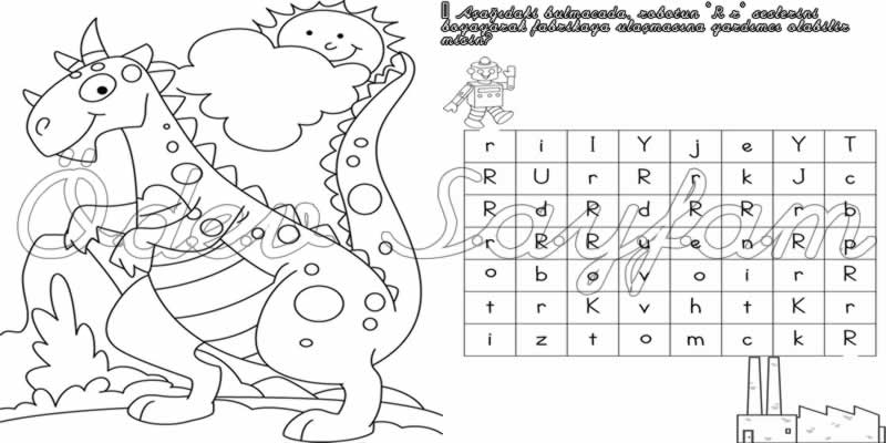 r harfi bulmaca ve dinozor renkli kalem boyama çalışması 3. grup sesler dik temel harfler 1. sınıf okuma yazma öğreniyorum