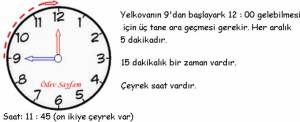 Yelkovan 9’dan başlayarak 12’nin üzerine gelene kadar üç ara geçer. Her ara 5 dakika olduğundan 15 dakika veya çeyrek saat var deriz. Akrep iki rakam arasını gösterir.