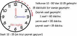 Yelkovan 12’den başlayarak 3’ün üzerine gelene kadar üç ara geçer. Her ara 5 dakika olduğundan 15 dakika veya çeyrek saat geçmiş olur. Akrep iki rakam arasını gösterir.