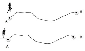 Soru: İki yarışçı A ve B pistlerinde aynı anda eşit hızlarla harekete geçiyorlar. Üstteki yarışçı B noktasına ulaştığında saat 15:20’yi gösteriyor. Diğer yarışçı 25 dakika sonra B noktasına ulaştığına göre 2. yarışçının varış zamanı kaçtır?