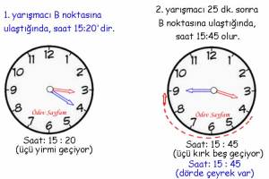 2. yarışmacı B noktasına 25 dk. sonra ulaşıyormuş. Bu durumda saate bakarak 15:20’den itibaren 5 tane aralık sayarız. ( 25 : 5 = 5 saatlerde her rakamın arası 5 dk. olduğunu söylemiştik.) Ulaştığımız sayı 9’dur. Bu da saatin 15:45 olduğunu gösterir. 2. yarışçının B noktasına varış zamanı 15:45’tir.
