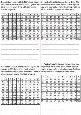 1. Aşağıdaki yüzlük tabloda ileriye doğru 4’ten başlayarak 100’e kadar dörder ritmik sayarak sayıların bulunduğu kutuları boyayınız. Tablonun altına tablodaki sayma örüntüsünü yazınız.