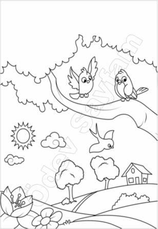 2. sınıf Görsel Sanatlar Dersi kuş ağaç manzara renkli kalem boyama