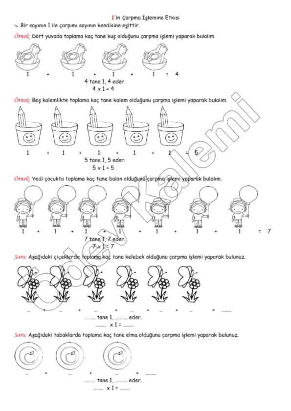 2. sınıf Matematik Dersi doğal sayılarla çarpma işlemi 1’in çarpma işlemine etkisi