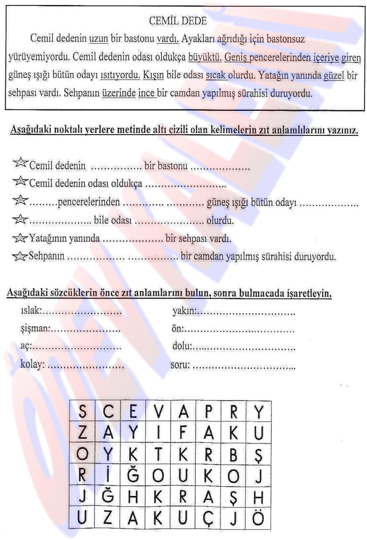 3. Sınıf Türkçe Dersi Değerlendirme test sayfası kağıdı yaprağı ders ödev fotokopi soruları 40 soruluk