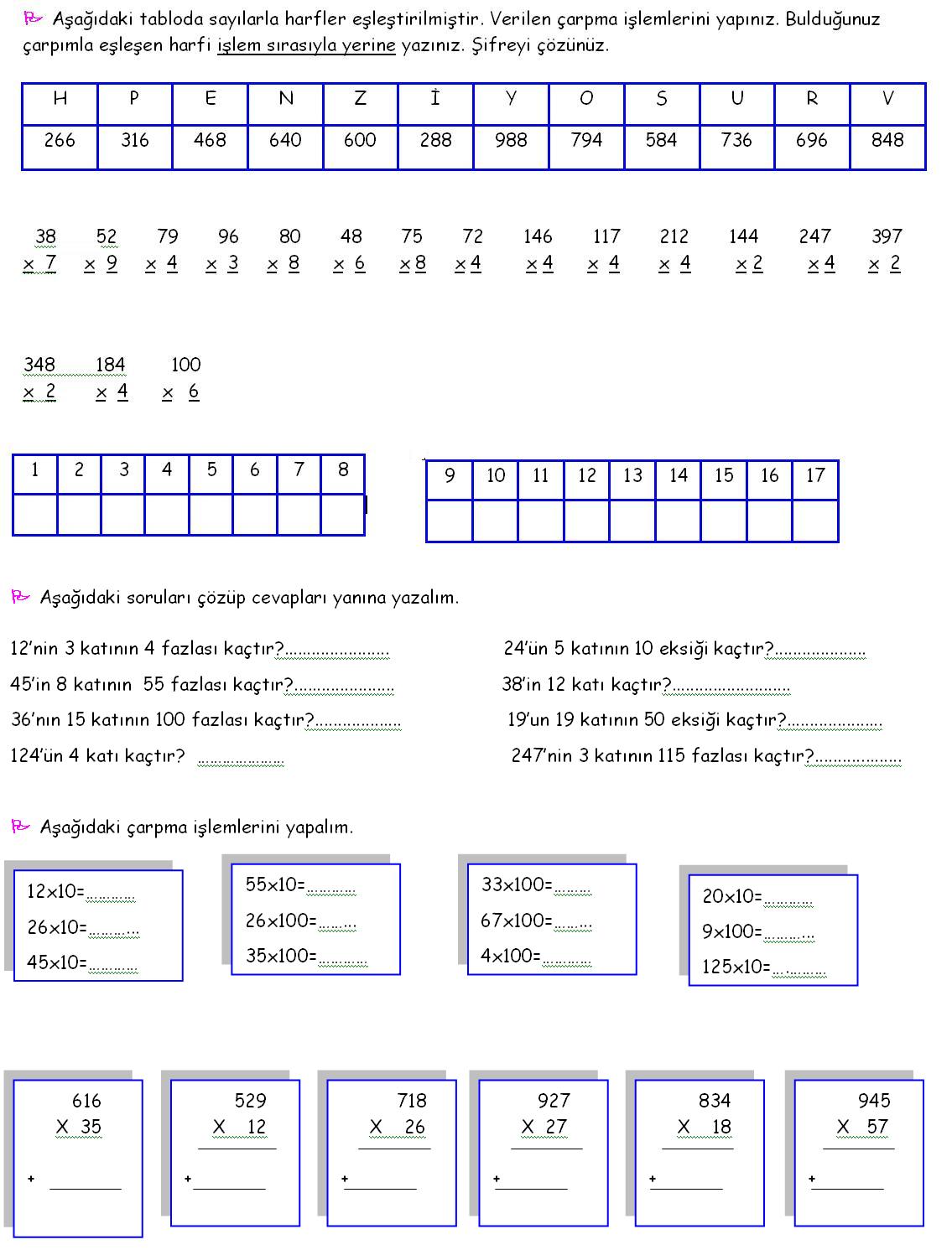 “3, 4 ve 375, 8000, 2 ve 800, 3425” uygun kelimeler yazınız.