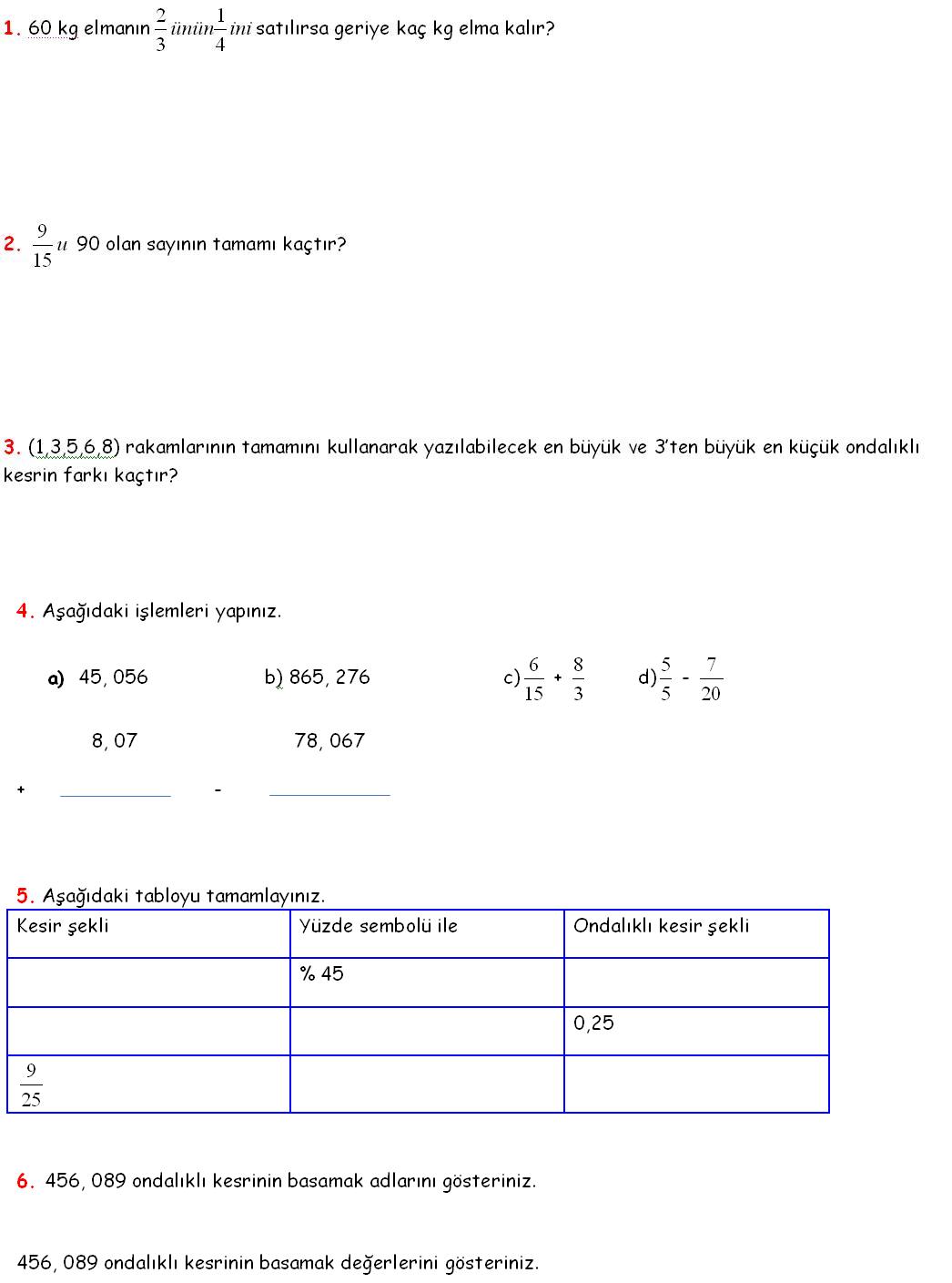 6. Aşağıdaki yüzdelik ifadeleri ondalık kesir olarak gösteriniz.